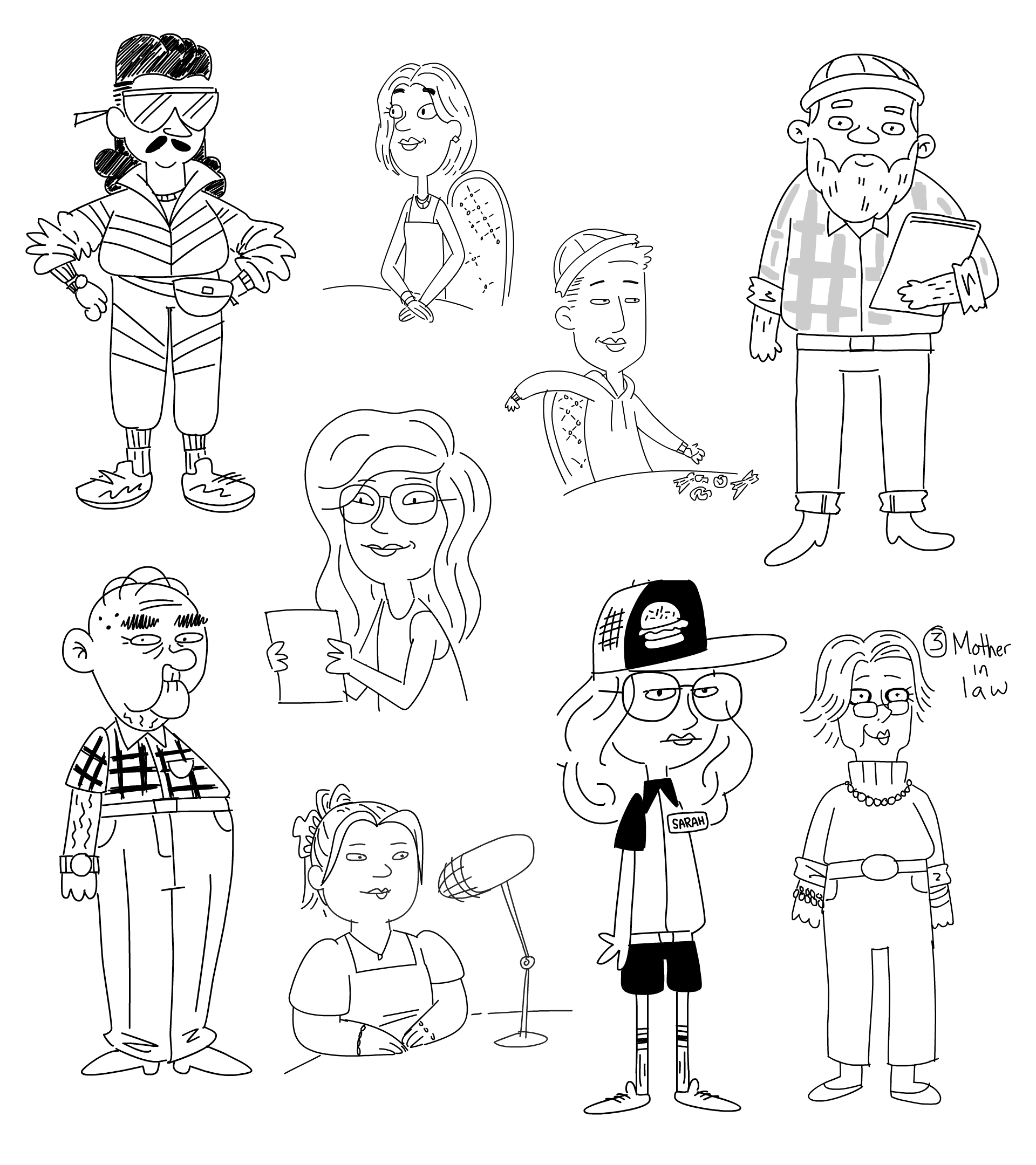 The characters were designed in a loose, sketchy style to match the lo-fi aesthetic of the reels. Each design leans into quick, exaggerated features—big glasses, bold outfits, or expressive posture—that make them instantly readable in short-form content. The simplified line work not only kept production light and efficient, but also reinforced the playful, tongue-in-cheek tone of the faux-podcast series.